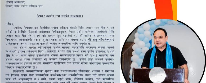 झापा, नेपाल उद्योग वाणिज्य महासंघको आसन्न निर्वाचन लक्षित गर्दै झापाको विर्तामोड उद्योग वाणिज्य संघले आफ्ना अध्यक्ष राजु न्यौपानेका पक्षमा समर्थन जुटाउन औपचारिक पहल थालेको छ ।संघले विभिन्न जिल्ला तथा ...